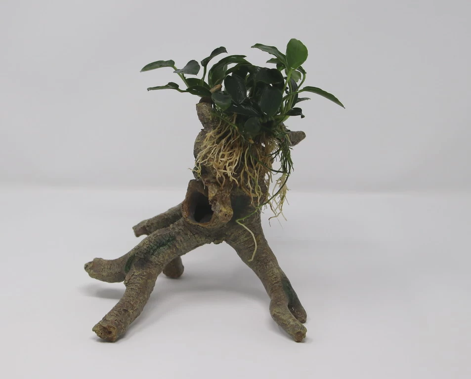 Der Stamm der Deko-Wurzel mit Höhle hat eine schöne Verästelung und Kriechende Anubias / Anubias nana ‚paxing‘ bildet die Blattkrone. Urwaldbäume werden in speziellen Klimazelten kultiviert, so dass sie in jedem Aquarium sofort gut weiterwachsen. Im Aquarium bilden die Urwaldbäume dichte, sattgrüne „Blattkronen“. Für Ihre Fische bieten Urwaldbäume Reviergrenzen, Rückzugsmöglichkeiten und Laichplätze. Die Pflanze kann mit der Deko-Wurzel sehr schnell umgesetzt oder aus dem Aquarium entnommen werden. Also sehr praktisch beim Herausfangen von Tieren aus dem Aquarium – hervorragend geeignet für Zuchtbecken. Die Deko-Wurzel besteht aus unverrottbarem Kunststoff mit zahlreichen feinen Details. Die Kunststoffwurzel hat keine scharfen Ecken und Kanten – die Verletzungsgefahr für Welse und andere Raspler ist somit absolut minimiert. Im Gegensatz zu Naturwurzeln gibt die Kunststoffwurzel keine Tannine ab, somit wird das Wasser nicht verfärbt.