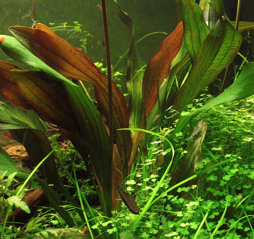 Etwas kleiner als die Sorte E. ´Green Chamäleon´ bleibt die neue Züchtung Echinodorus ´Red Chamäleon´ mit ca. 30 cm Wuchshöhe. Sie zeigt bereits im emersen Habitus eine rötliche Färbung der Blattspreiten, die wahre Schönheit kommt allerdings erst im Aquarium zur vollen Geltung. Bei starker Beleuchtung ist der Habitus besonders kompakt und die Herzblätter färben sich kräftig dunkelrot. Nährstoffreicher Bodengrund, regelmäßige Flüssigdüngung und ausreichend CO2 sind Garanten für einen prächtigen Wuchs.