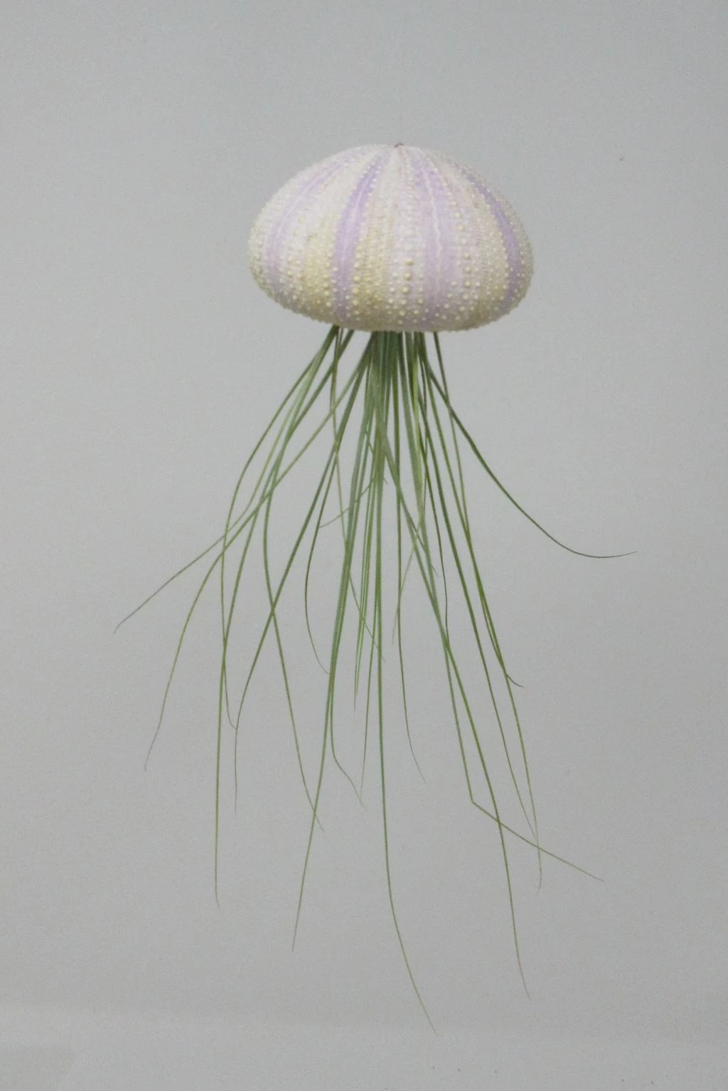Ein Seeigelgehäuse mit Tillandsia juncifolia ist eine faszinierende Verbindung zwischen einem natürlichen Meeresfund und einer eleganten Tillandsienpflanze. Diese einzigartige Kreation kombiniert die Schönheit der Unterwasserwelt mit einer schlanken, luftliebenden Zimmerpflanze, die ohne Erde auskommt.