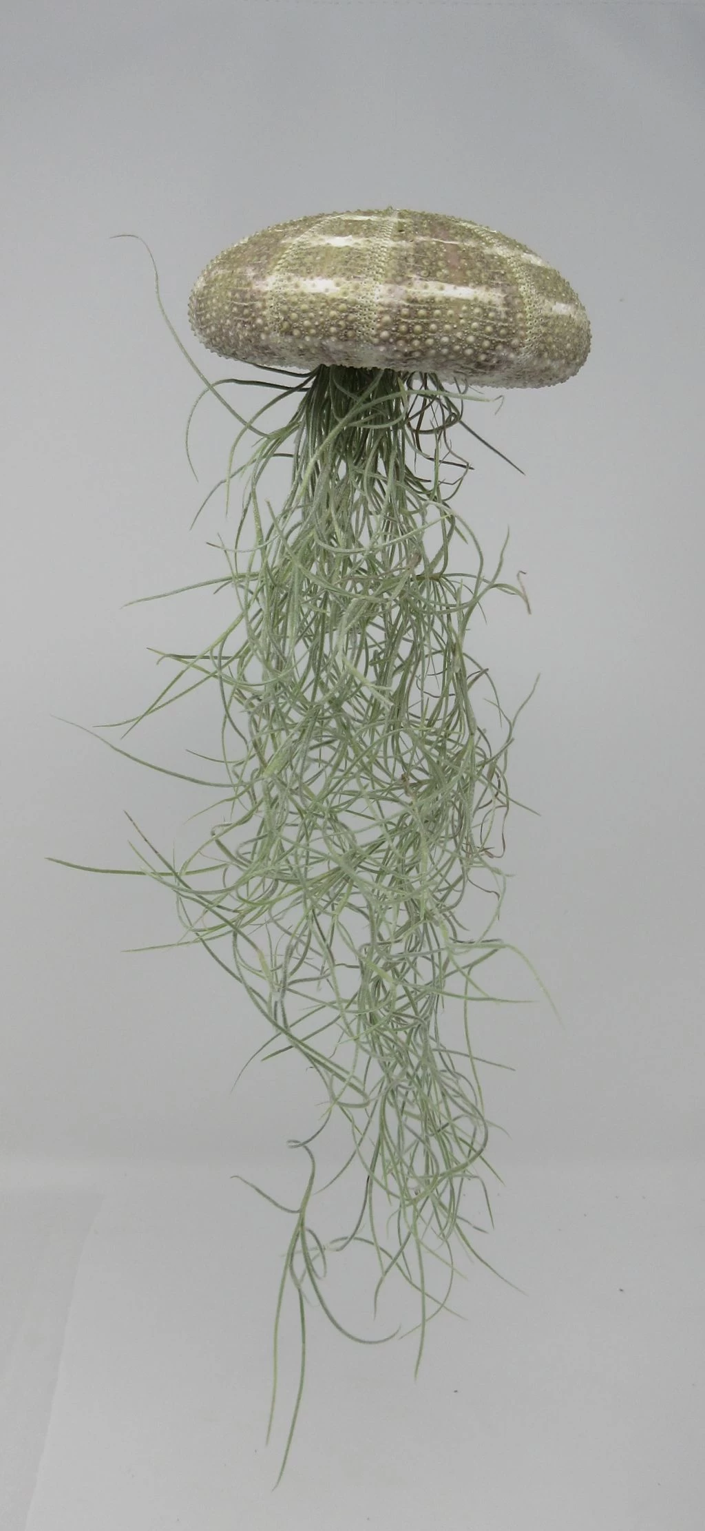 Das Seeigelgehäuse dient als natürlicher Pflanzgefäß für Tillandsia usneoides, auch bekannt als „Spanish Moss“ oder „Barbados Flechte“. Diese Pflanze zeichnet sich durch ihre zarten, silbergrauen Fäden aus, die an lange Bärte erinnern und einen faszinierenden Anblick bieten. Zusammen sieht es aus wie schwebende Quallen oder Tintenfische.